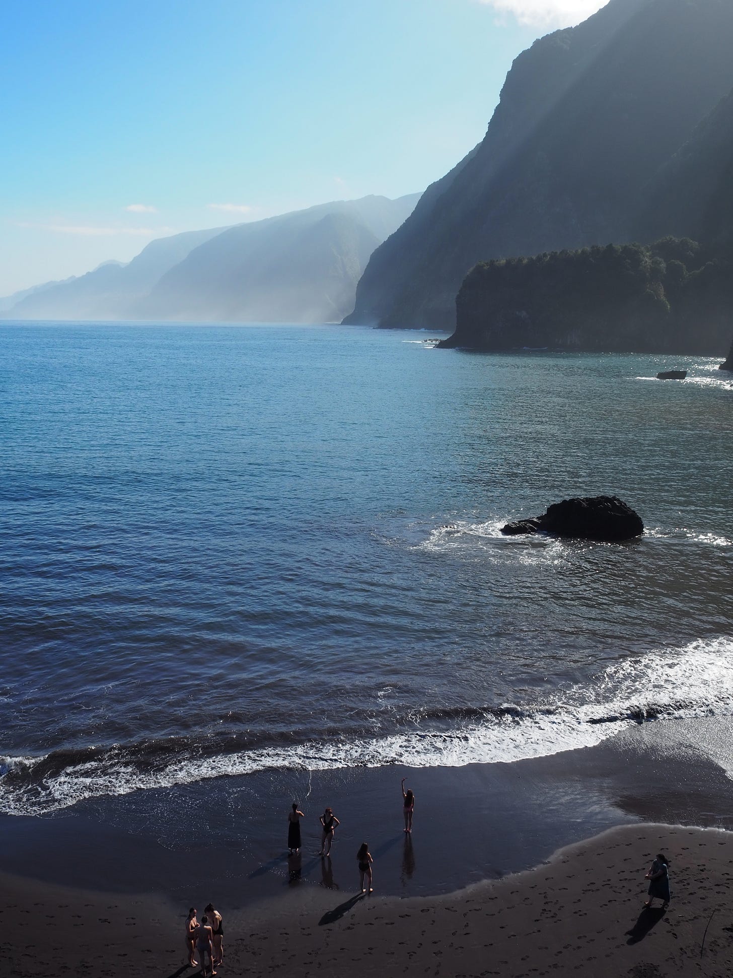 The sand, as dark as it was, held all the heat of the morning. Stripping off we went skipping down to the glittering sea, hesitating slightly at that midriff level that always seems to be the hardest to get past, no matter how warm the water is, before slipping in and swimming out.
