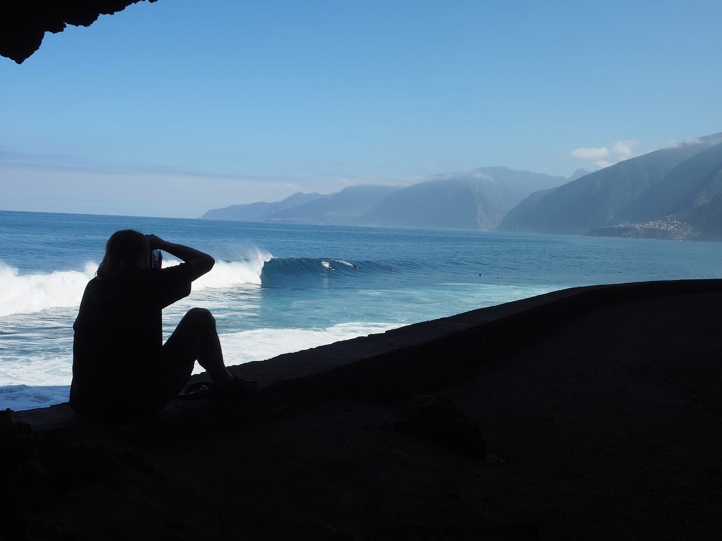 On our drive back around the island, gazing out the open window as I always did, I spotted some surfers who had found a wave, and a big one at that. The beaches on the island always had a break wall to shelter swimmers from the powerful ocean waves that smashed against the rest of the coastline. We found the nearest place to park walked through one of the old, disused tunnels to get closer. It was cold in there and pitch black in the middle save for the tiny dot of light where it came out. But when we emerged we were right in front of the peak with a backdrop of hazy blue mountains.